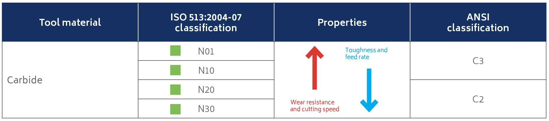 Table 3. Carbide tool ISO and ansi classifications.