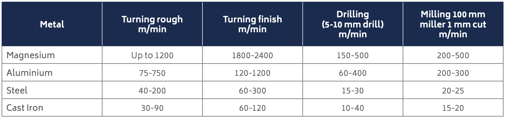 The potential for high speed machining of magnesium alloys is usually only limited by the stability of the component in the clamping device, chip extraction or the rotation speed or accuracy limits of the tool or machine. Some relative cutting speeds using HSS tools are given in Table 2. Cutting speeds are also dependant on the tool material. Higher speeds can be enjoyed with the use of carbide or poly-crystalline diamond (PCD) tooling.