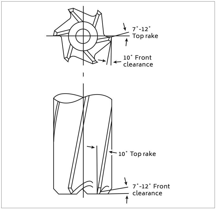 Milling cutters should have one-half to one-third the cutting edges found on conventional milling tools used on other metals such as steel. Having fewer teeth assists with chip clearance due to the increase in chip space and also reduces the frictional heat associated with a greater number of teeth rubbing on the work piece. Simple types of two and fourcutter side and face mills are illustrated in Figure 2. It is possible to successfully use slot drills instead of end mills and 2 blade fly cutters for high speed milling operations. Front and side relief angles of 7–10 ̊ and secondary clearance angles of 20 ̊ are recommended.