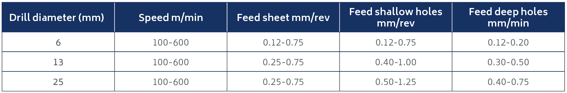 It is recommended that high speeds and medium feeds are used in order to obtain the best surface finish with the greatest dimensional accuracy of the holes.