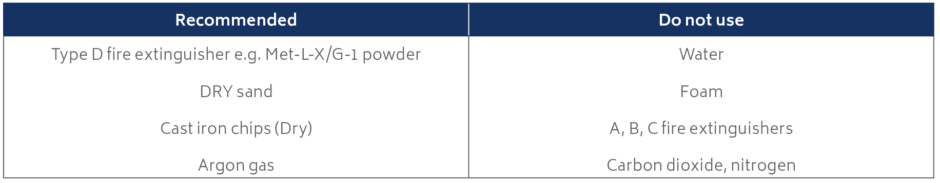 These should be placed in dry, tightly closed, non-combustible containers such as UN approved steel drums. Safely stored, kept dry and clearly labelled. Storage should be in a dry atmosphere and in isolation from flammable materials. Chips covered in mineral oil can be stored the same way as dry chips.