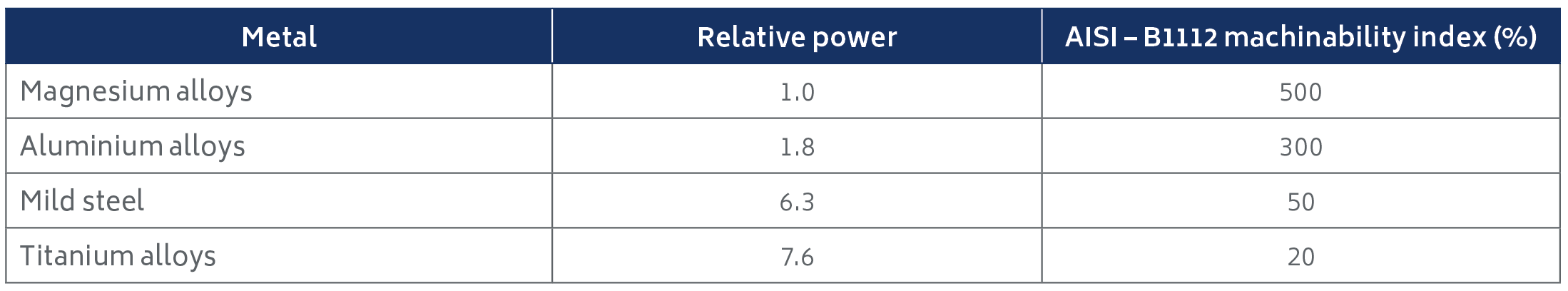 Table 1. Relative power and comparative machinability of metals.