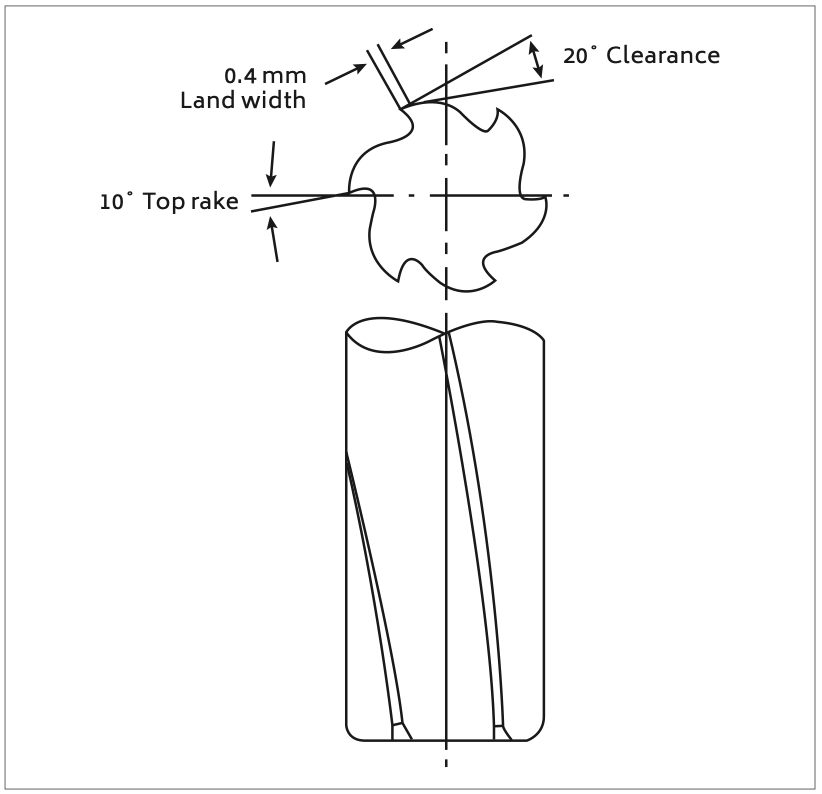 The cutting edges should be sharp, flutes polished and, if necessary, enlarged to aid chip clearance and avoid the build up of chips. To improve surface finish and tolerance the corners of the cutting edge should be rounded slightly.