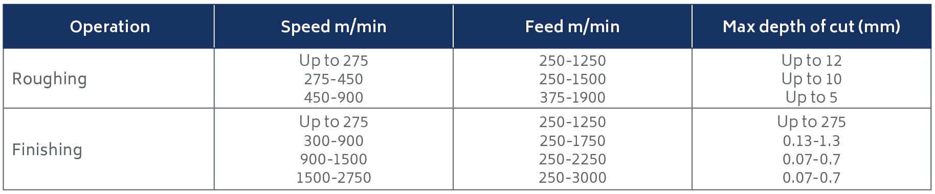 In general, cutting speeds are between 200–1,800 m/min with feed rates greater than 0.25 mm/rev for turning and boring operations. Face milling however, can be carried out at speeds up 3,000 m/min (10,000 ft/min) with feed rates between 0.05 and 0.5 mm/tooth. Depths of cut can be up to 12 mm. It should be noted that certain drilling, reaming and tapping operations are unsuitable for high speed machining.