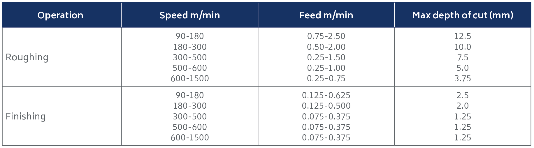 Table 6. Speeds, feeds and depths of cut for turning and boring – HSS tooling.