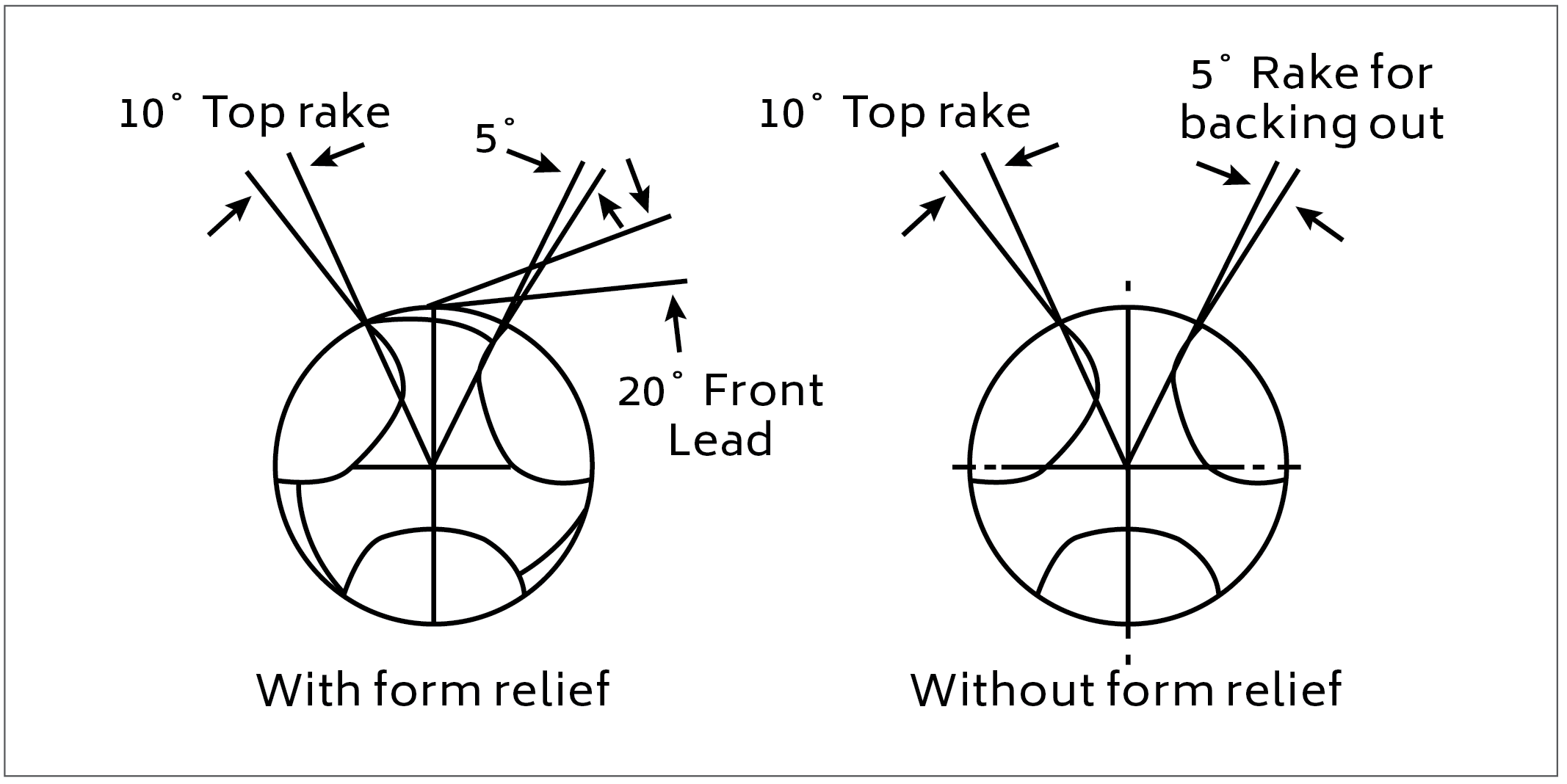 Clearance angles of 10–15 ̊ are recommended. The use of a large clearance angle helps to prevent the tool rubbing on the work piece; this ultimately reduces the heat generated by friction. Rake angles need not exceed 3–5 ̊, but for minimum power consumption may be increased to 15–20 ̊. The rake angle should be slightly smaller for carbide tools compared to HSS tools; this allows greater support to the cutting edge and prevents breaking or chipping of the carbide insert. The use of a small rake angle may help to reduce chatter. The side rake angle may be between 0–10 ̊ and the side clearance angle should not be less than 7–10 ̊.