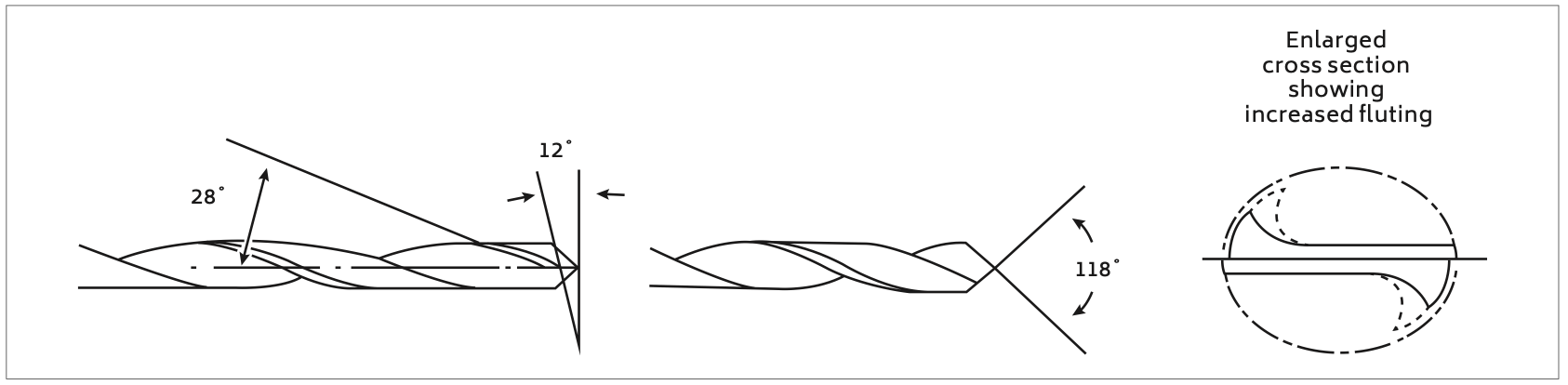 For drilling shallow holes i.e. where the depth is less than 4 times the drill diameter, standard drills of about 28 ̊ helix angle can be used. The point angle should be approximately 118 ̊, with a relief angle of about 12 ̊ (see Figure 3). The chisel edge angle should be in the range 120–135 ̊.