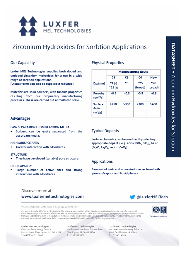 Luxfer MEL Technologies supplies both doped and undoped zirconium hydroxides for a use in a wide range of sorption applications – Oxides forms can also be supplied if required. Our materials are solid powders, with tuneable properties resulting from our proprietary manufacturing processes.